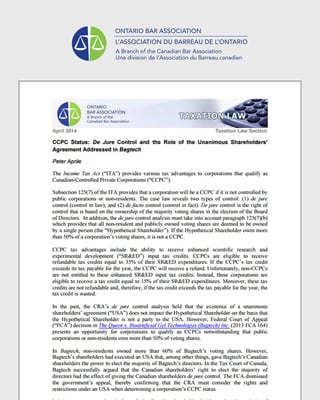 In the past, the CRA’s de jure control analysis held that the existence of a unanimous shareholders’ agreement (“USA”) does not impact the Hypothetical Shareholder on the basis that the Hypothetical Shareholder is not a party to the USA. However, Federal Court of Appeal (“FCA”) decision in The Queen v. Bioartificial Gel Technologies (Bagtech) Inc. (2013 FCA 164) presents an opportunity for corporations to qualify as CCPCs notwithstanding that public corporations or non-residents own more than 50% of voting shares.